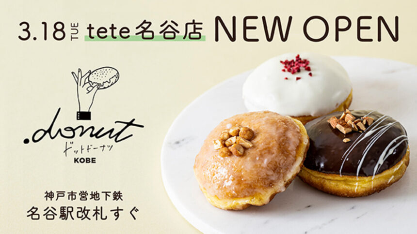 神戸市営地下鉄名谷駅改札前の名谷駅ビル「tete名谷」南ゾーンに生ドーナツ専門店「.donut (ドットドーナツ)tete名谷店」が2025年3月18日オープンです。「.donut(ドットドーナツ)」は地産地消をうたい兵庫県産の小麦、神戸市産の牛乳、淡路島産の卵を原材料として使用した手作り生ドーナツのお店です。