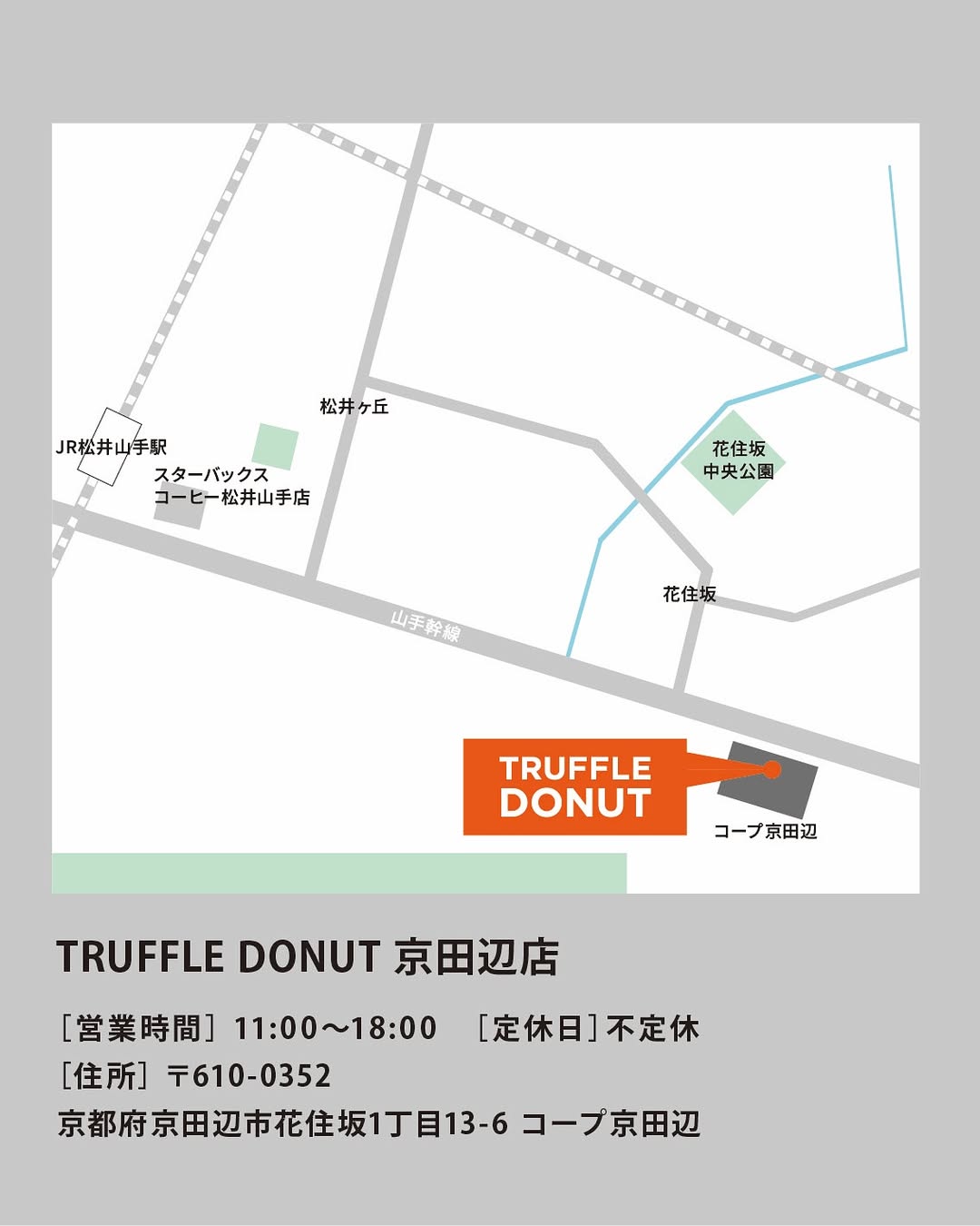 「TRUFFLE DONUT京都 京田辺店」アクセスや行き方。駅ではJR学研都市線「大住駅」から徒歩13分、「松井山手駅」から徒歩17分
