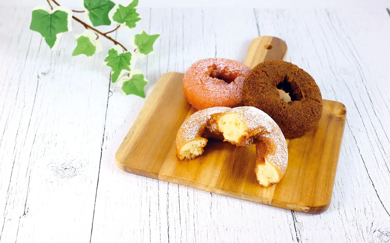- 「ミルキー」にも使われている北海道産の練乳を生地に練り込み、米油で揚げた、軽いくちどけが特徴です。プレーン、いちご、チョコレートなど、様々なフレーバーが楽しめます。