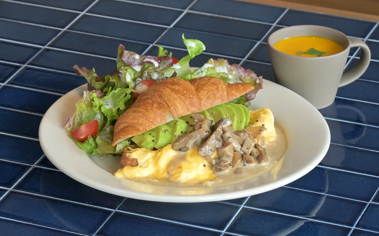 - アボカドとオムレツのクロワッサンプレート(1,760円): バター香るクロワッサンに半熟オムレツとアボカドを組み合わせ、ポルチーニ香るキノコクリームソースで仕上げた、ご褒美モーニングにぴったりなプレート。