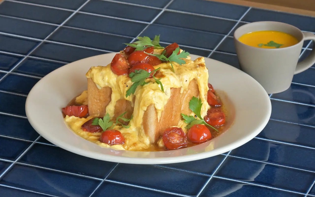 - トマトと半熟タマゴのオーバートースト(1,760円): 日本初製法で焼き上げたふわもち食パンにモッツァレラと半熟オムレツを乗せた、特別なオーバートースト。