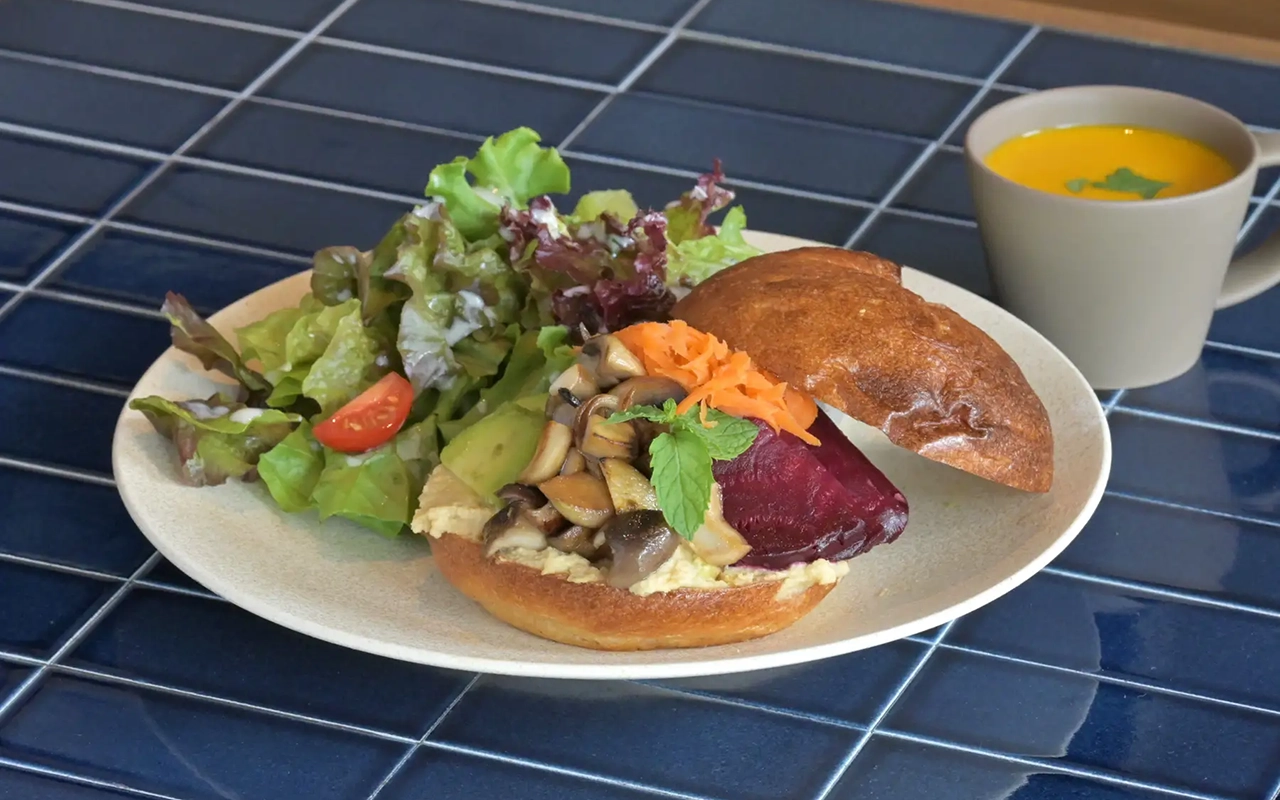 - 米粉ベーグルヴィーガンサンド(1,650円): グルテンフリーの米粉生ベーグルに彩り野菜をたっぷり挟んだ、ヘルシーで贅沢な一品。