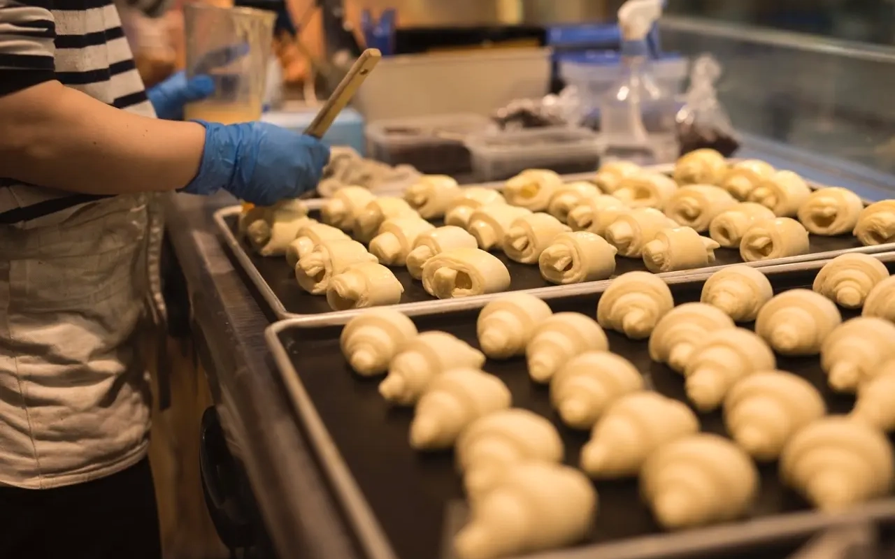ミニヨンのミニクロワッサンは、機械では再現できない「外はサクッと、中はモチッと」の食感を実現するため、創業以来変わらず*作業で生地を折り重ねる「手折り製法」で作られています。この製法により、毎日16万個以上の生地が作られています。